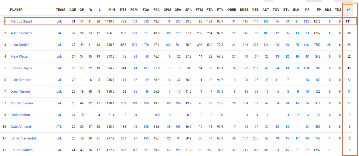 这一战过后,斯马特的赛季总正负值达到了+141,继续在湖人队内断层排名第一。里夫斯+90排名全队第二,东契奇+69排名全队第三,克勒贝尔+52第四,海斯+45第五。詹姆斯本赛季的正负值+2排名第11。湖人队内正负值最低的球员是拉拉维亚,数值为-93,其次是艾顿的-65。